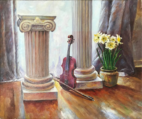 Oil Painting Violin Still life Wall Art Flowers Columns Free Domestic Shipping Wall Decor Original on Linen Canvas Ready to Hang