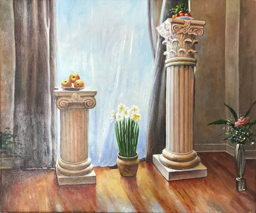 Oil Painting Still life Wall Art Flowers Fruit Columns Free Domestic Shipping Wall Decor Original on Linen Canvas Ready to Hang